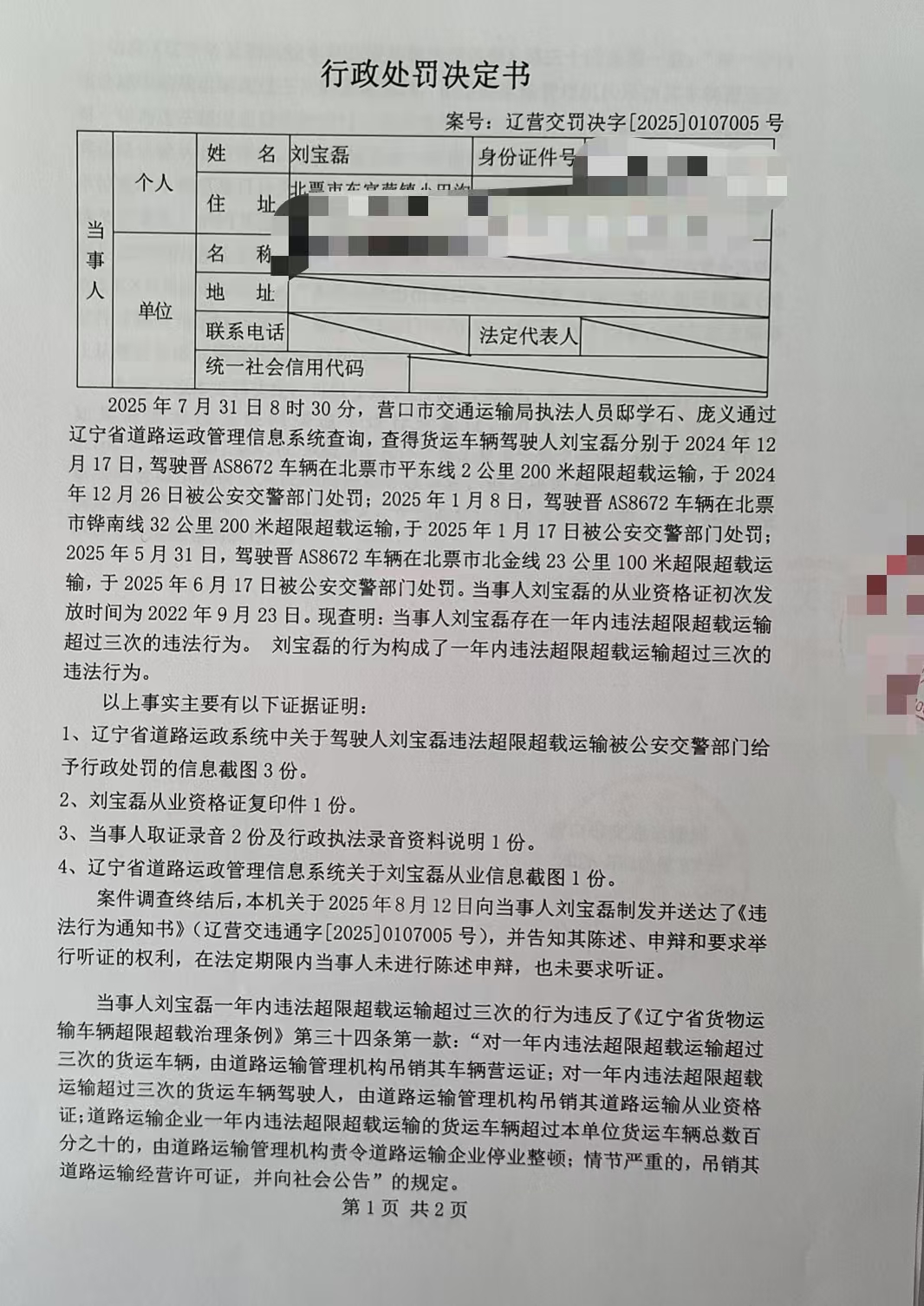 行政处罚决定书 辽营交罚决字【2025】0107005号